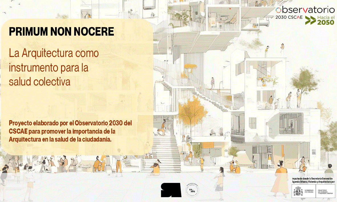 Conscientes de la necesidad de trasladar este concepto a la sociedad, el Observatorio 2030 del Consejo Superior de los Colegios de Arquitectos de España (CSCAE) desarrollará, gracias a una ayuda del Ministerio de Vivienda y Agenda Urbana para la difusión, el fomento y la investigación de la arquitectura, “Primum non nocere”, un proyecto educativo que busca promover la importancia de la Arquitectura para la salud colectiva.